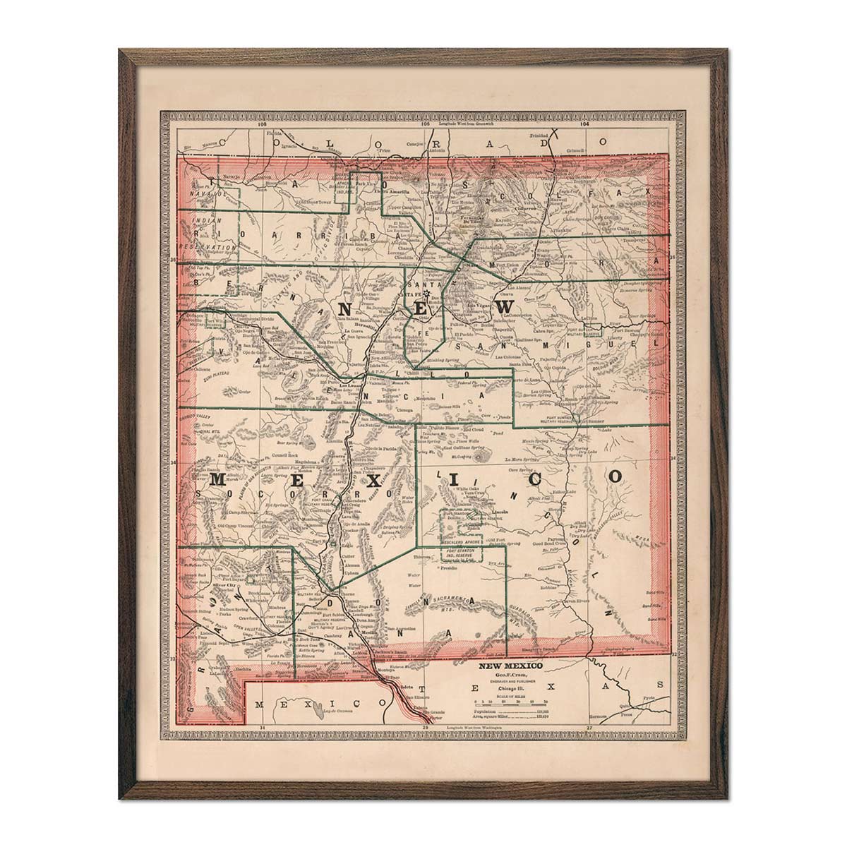 New Mexico 1895 original map of New Mexico colored engraving